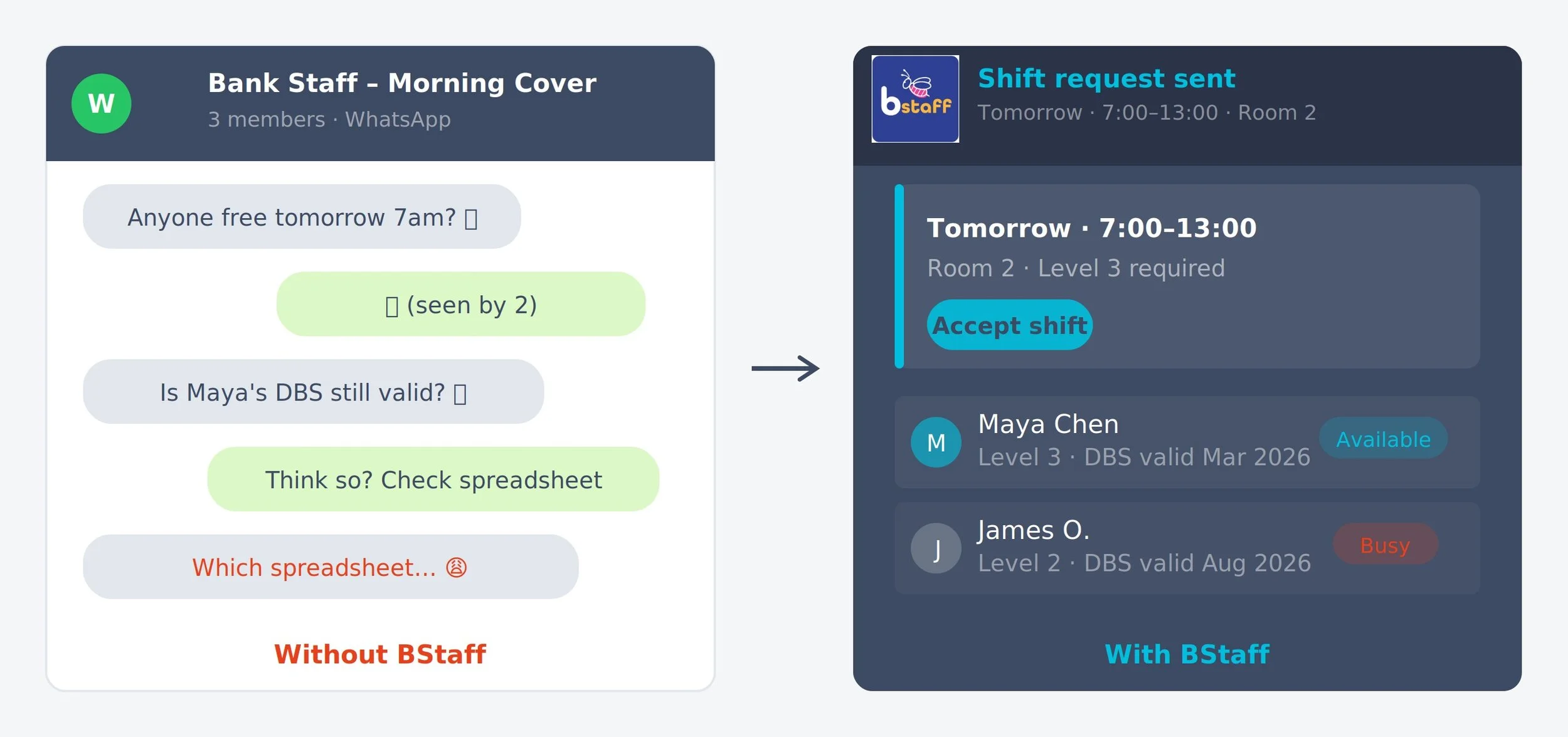 Ask any nursery manager how they manage their bank staff and the answer is almost always the same: a group chat, a spreadsheet, and a lot of chasing. Someone sends a message at 7am. Half the group don't see it. The ones who do respond with a thumbs up that you have to manually cross-reference against their DBS expiry date and the shift they last worked.